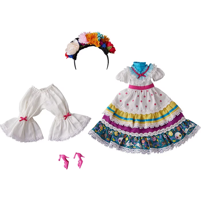 The outfit, produced by Rico* of vanilatte, preserves the appearance of traditional DÃa de Muertos clothing with an added Harmonia bloom touch.