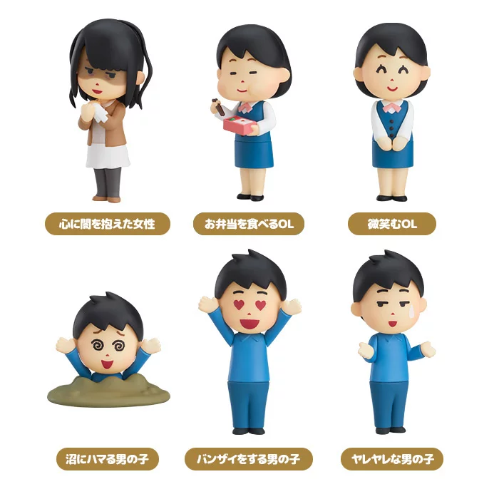 The cute “irasutoya” free illustrations have been transformed into figures keeping their iconic appearance as faithfully as possible! The line-up includes: Woman with Darkness in Her Heart, Office Lady Eating Bento, Smiling Office Lady, Man Stuck in Mud, Man with Hands Raised and Sighing Man for a total of six to collect! Be sure to collect them all!